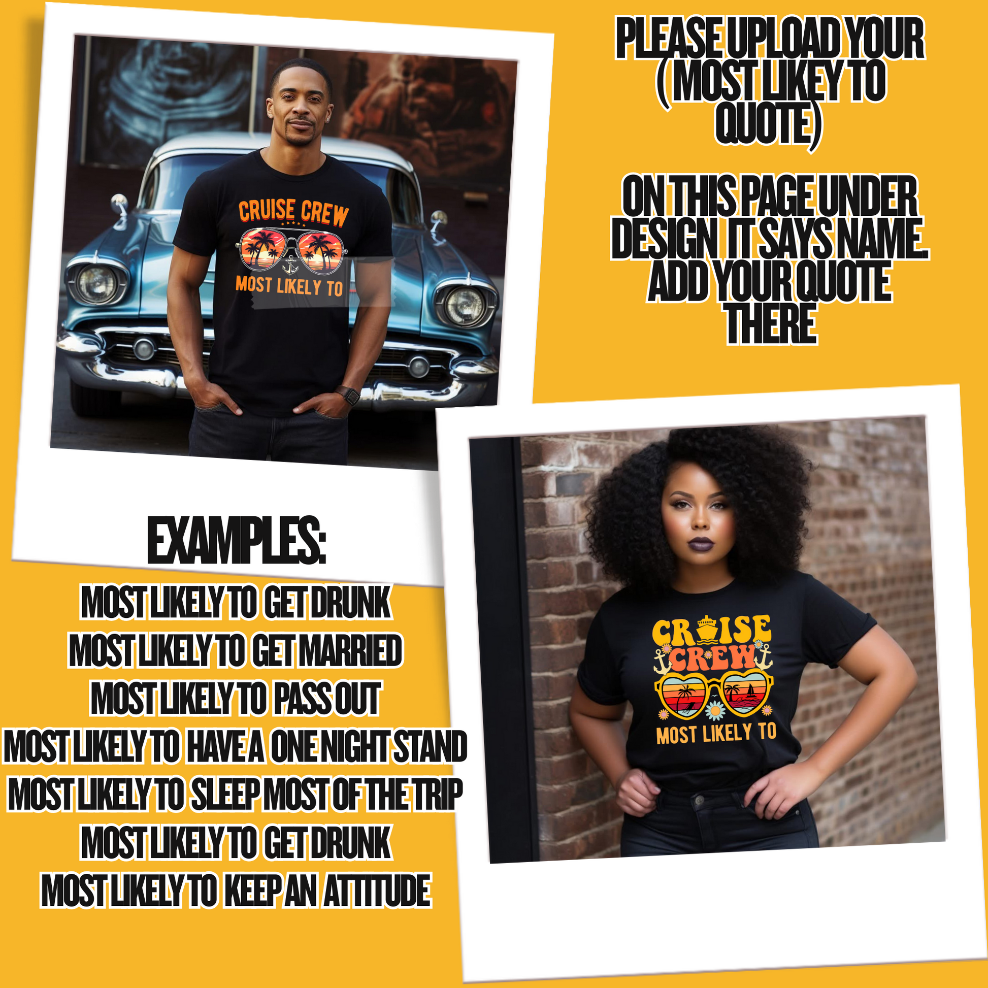 Makw sure to add what you want your most likely quote to be. There is a spot on this page that says name. Add quote there. If you need help coming up with something, go to Etsy and look up most likely to shirts and you can get some ideas.